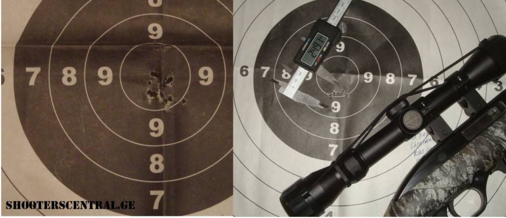 მარცხნივ არის სამიზნე რომელშიც ნასროლია 20-მდე ვაზნა რუსული წარმოების TОЗ-78-დან (“ბოლტი”), მარჯვნივ არის 5 გასროლიანი ჯგუფი Mossberg 702-დან (ნახევრადავტომატი). ხედავთ რამე მნიშვნელოვან სხვაობას? სროლა ხორციელდებოდა დახურულ ტირში, მაგიდიდან, 50 მეტრზე.