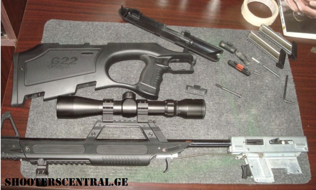 ეს G22 ჯერკ იდევ არ არის დაშლილი გასაწმენდად. ჯერ იშლება მრავალკომპონენტიანი პლასტმასის კორპუსი დ აშემდეგ ქვედა ჩარჩო და ლულის კოლოფი. დეტალების რაოდენობა არის ძალიან დიდი. მათი დაკარგვა ადვილია.